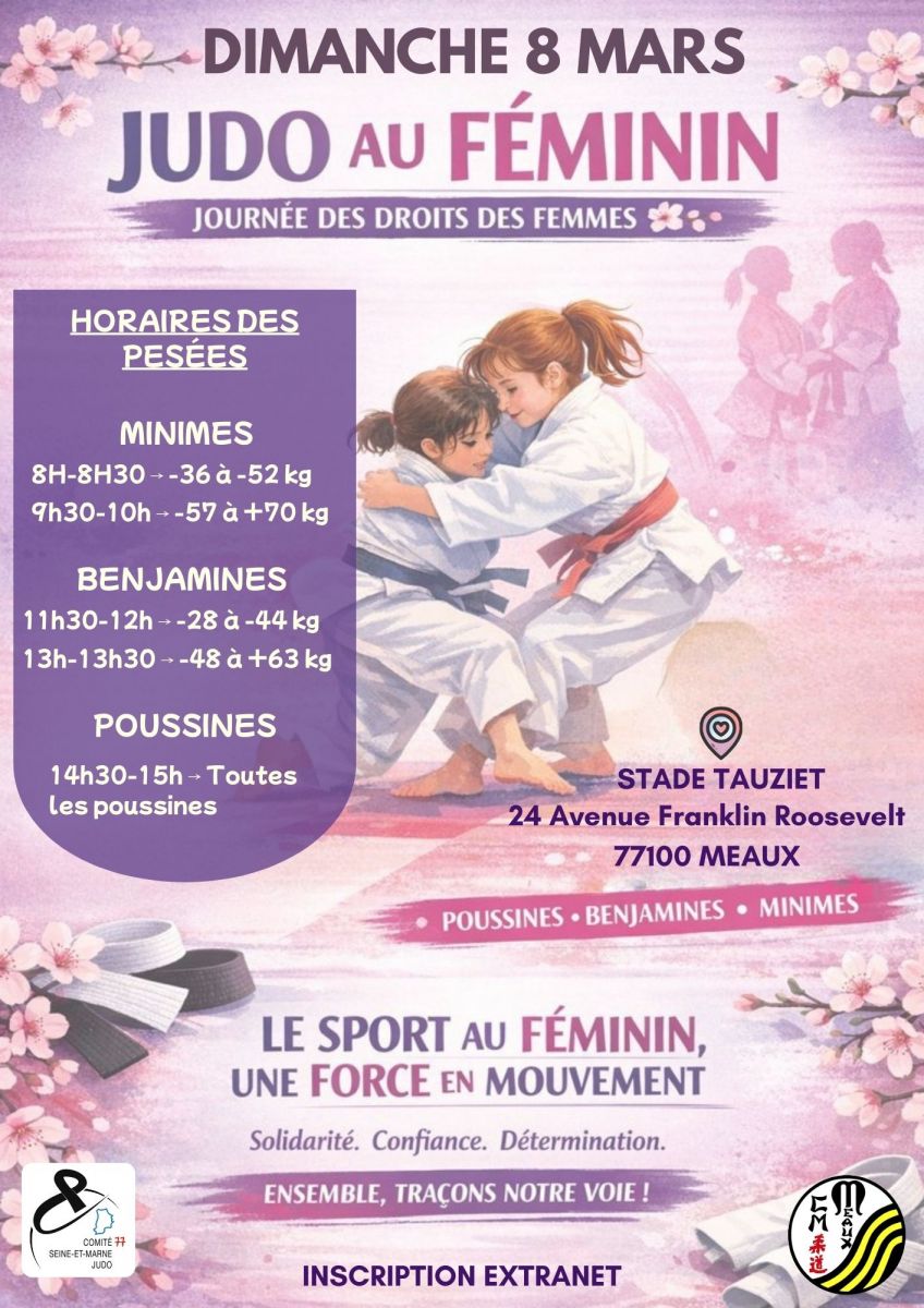 Le Comité et le Cercle Mikage Judo Meaux vous invitent à une animation judo de la catégorie MINIMES / BENJAMINES / POUSSINES le dimanche 8 mars pour célébrer la Journée de la Femme
